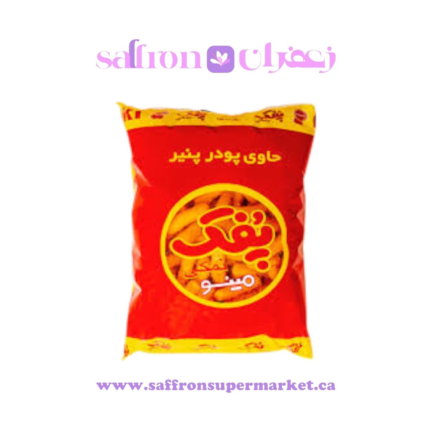 Minoo Cheese Puffs, universally known by the Persian name Pofak (which is also the registered trademark for this product line), are a classic Iranian extruded corn snack. These light, airy, and crunchy cheese-flavored puffs are iconic in the region. They are dusted generously with a savory, tangy cheese powder, making them a very popular and addictive savory snack for all ages.