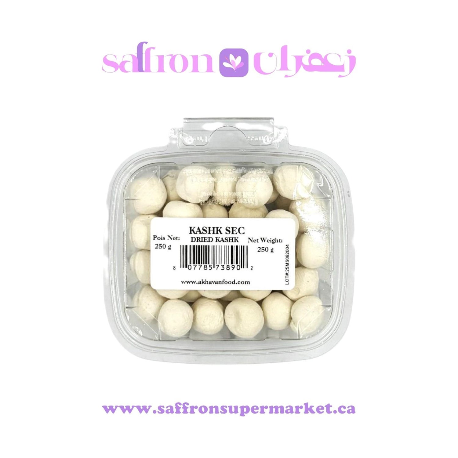 Akhavan Dried Kashk is a traditional Persian dairy product (Qurut or Kashk) made from dried, strained yogurt or whey. These hard, white spheres or discs are typically soaked in water and then dissolved to create a thick, tangy, and highly concentrated liquid. It is an indispensable, unique ingredient for famous Persian dishes like Ash-e Reshteh (Noodle Soup), Kashk-e Bademjan (Eggplant Dip), and Haleem. It adds a signature sour flavor and creamy texture.